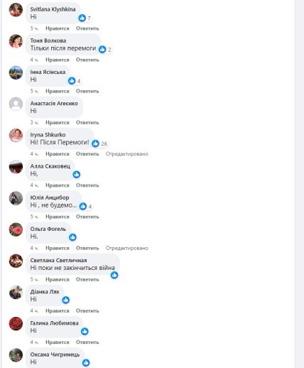 За 5 годин цей пост набрав понад 400 коментарів. І, відповідно до них, більша частина українців цього не робитиме. При цьому найпопулярніша відповідь була такою: "Після перемоги".