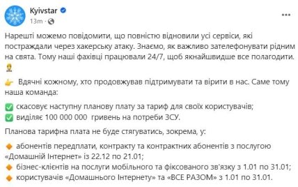 "Нарешті можемо повідомити, що повністю відновили усі сервіси, які постраждали через хакерську атаку. Знаємо, як важливо зателефонувати рідним на свята. Тому наші фахівці працювали 24/7, щоб якнайшвидше все полагодити", – йдеться у повідомленні.