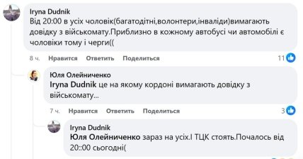 У коментарях під постом повідомляють, що проблеми на кордоні розпочалися 29 грудня близько 20:00. Від чоловіків вимагають довідку від військкомату із дозволом на виїзд. Через те, що майже в кожному транспортному засобі є хоч один чоловік, на кордоні утворилися величезні черги. Також українці зазначають, що на гарячій лінії ДПСУ кажуть, що на кордоні все без змін.