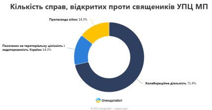 Від початку повномасштабного вторгнення Росії Служба безпеки України відкрила принаймні 7 кримінальних проваджень проти священнослужителів УПЦ МП. Найбільше кримінальних справ було відкрито через колабораційну діяльність.