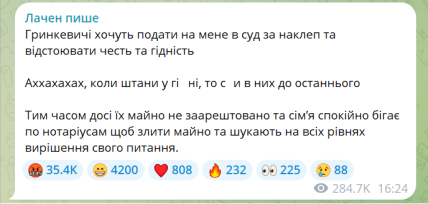 Зазначимо, що блогер виклав в Інстаграмі два пости, в яких описав, як родина Гринкевичів заробляла на війні та куди витратили гроші. Лаченков написав, що це "просто неймовірний рівень мразотства".