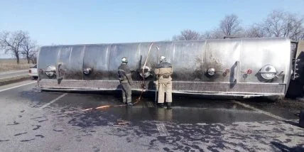 По прибуттю до місця рятувальники встановили, що попередньо під час руху, у вантажного автомобіля "Renault Magnum" (вантаж - 24 тонни соняшникової олії в цистерні) лопнуло колесо, внаслідок чого транспортний засіб перекинувся на бік. З цистерни на дорогу витекло близько 10 тонн олії. Частково перекрито рух транспорту в напрямку міста Запоріжжя.