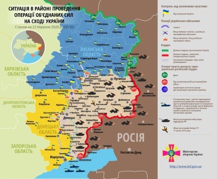 Станом на 12.30 22 березня російсько-окупаційні війська випустили п'ять мін по опорних пунктах підрозділів Об’єднаних сил поблизу Водяного.
