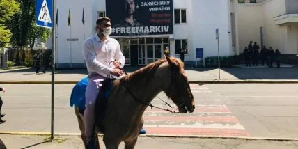 Валентин Бур'янов, який вплав намагався дістатися до зачиненого на період карантину Гідропарку, приїхав на коні до МВС із зверненням до глави відомства Арсена Авакова.