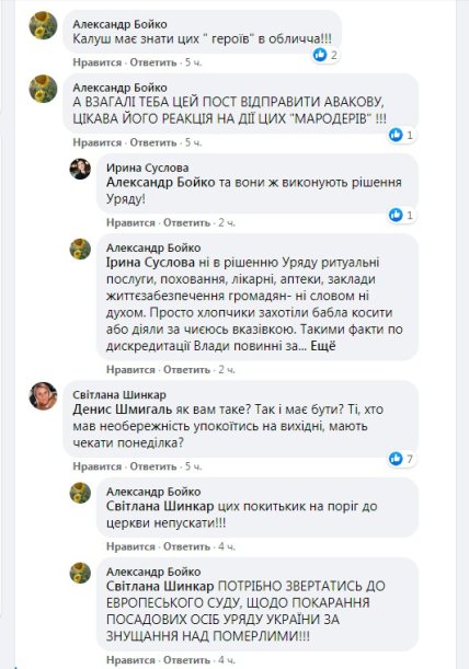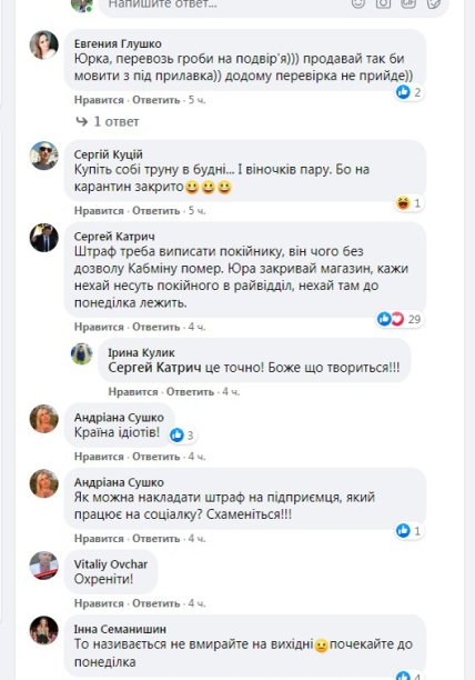 Ось тільки мала частина висловлювань з більш ніж 200 коментарів під повідомленням про візит поліцейських. Володимир Микитин: «Карантин так карантин! Закритими повинні бути всі! Яка різниця - похорон це або весілля! Кафе або школа!».