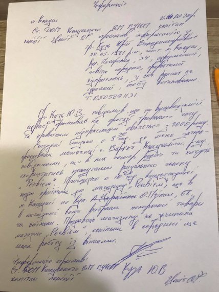 Поки поліцейський писав папери в магазині, Юрій Кузь сфотографував цей процес і виклав в Фейсбук, про себе зазначивши - погана це реклама його підприємству або хороша, але все ж реклама. Вирішив, що протокол буде оскаржувати, не доводячи справу до суду. А обговоривши з продавцем робочі питання, надумав поспілкуватися з начальником калуського відділення поліції.