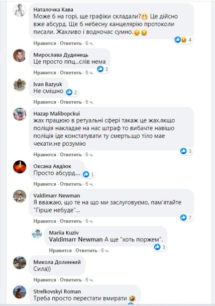 «Жах! Також працюю в ритуальній сфері. Якщо поліція накладає на нас штраф, то, вибачте, навіщо поліція їде констатувати ту смерть? Що, тіло повинно чекати? Не розумію», - пише один з користувачів.