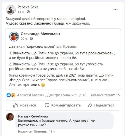 В результаті, між жінками зав'язалася дискусія. Сємєйкіна написала, що міркування автора про Путіна і російськомовних українців - нібито "випендрьож", і куди, мовляв, "не лізуть україномовні".