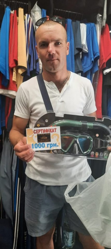 -Прийшов: дуже чемна, дуже порядна людина, нічого не хотів брати, - каже власник бізнесу. І я йому подарував набір для водного плавання. А він радіє: "О, племіннику подарую!". Думаю, ну якщо племіннику, значить, треба і щось особисто Андрію. І вручив йому подарунковий сертифікат на 1000 гривень, щоб він сам міг вибрати в нашому магазині те, що захоче. Ми з ним також сфотографувалися на пам'ять.