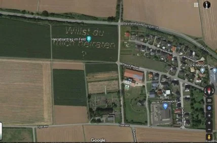 Дотепно, але приблизно у ці ж дні поле Стефана потрапило до кадрів, зроблених супутником Google Maps. Тепер його унікальну пропозицію коханій можна відшукати в додатку (місто Хюттенберг, Німеччина).