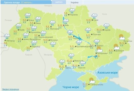 У Києві і Київській області 27 лютого дощ, температура вночі 1-6° тепла, вдень 6-11°. 28 лютого вночі помірний, вдень невеликий дощ, місцями з мокрим снігом; температура вночі від 2° морозу до 3° тепла, вдень 1-6° тепла.