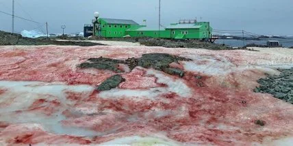 Сніг біля української антарктичної станції "Академік Вернадський" забарвився у милиновий колір, завдяки мікроскопічним сніговим водоростям.