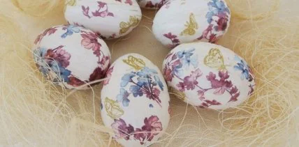 Таке забарвлення називається декупаж. Для того, щоб зробити ось такі яскраві та гарні яйця вам знадобиться кілька тришарових серветок (вибирайте на свій смак, чим більше різних деталей на серветці — тим краще). Яйця для фарбування мають бути білі, жовті яйця скрадають яскравість. Також приготуйте трохи яєчного білка в окремій широкій тарілочці.