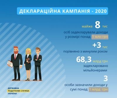 "За підсумками деклараційної кампанії -2020 майже 8 тис. осіб задекларували доходи у розмірі понад 1 млн грн. Кількість таких громадян зросла на 3 тис. порівняно з минулим роком", - йдеться у повідомленні.