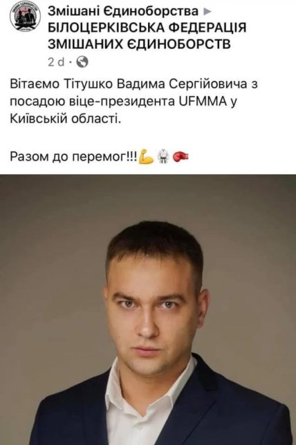 На Київщині, скандально відомий спортсмен з Білої Церкви Вадим ТІТУШКО зайняв місце на посту віце-президента Української федерації змішаних бойових мистецтв. Про це повідомили в Фейсбуці Білоцерківської федерації ММА.
