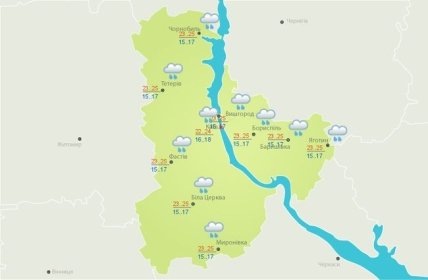 У центральній частині України 25 серпня очікується хмарна погода, пройдуть дощі. Температура повітря вночі +15 ... + 17 °, удень +26 ... + 28 °.