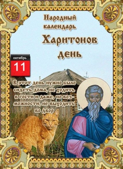 У цей день, 11 жовтня, православна церква згадує святителя Харитона Сповідника, єпископа. У Харитонів день людям похилого віку радили за поріг носа не потикати, щоб не накликати біду.