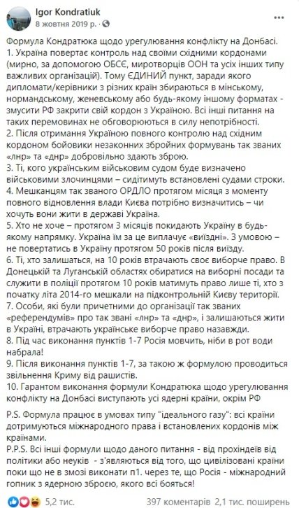 - Моя «формула» (яка, нагадаю, стала моєю маленькою відповіддю на так звану «формулу Штайнмайєра») є актуальною і досі. Не лише для Донбасу, а й для повернення Криму. Зараз їхав і слухав у авто радіо НВ, і Сергій Притула проводив опитування якраз на тему виборів на непідконтрольних територіях – коли, на яких умовах, хто голосує і т.д. Так от, думка слухачів була схожа на мої думки, викладені у «формулі Кондратюка». Моя формула є ідеальною схемою повернення окупованих Донбасу та Криму в Україну на умовах держави Україна. Але всяку ідеальну схему майже неможливо реалізувати без маси умов. На жаль…