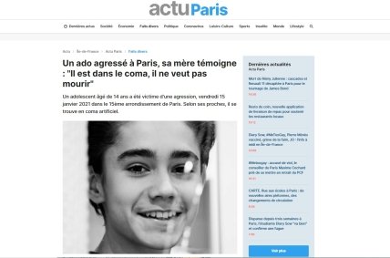 "14-річний підліток став жертвою нападу в п'ятницю, 15 січня 2021 року, у 15-му окрузі Парижа. Хлопчика доставили в лікарню у важкому стані, після чого він впав у кому. Його родичі шукають свідків. Напад стався близько 18:30, в районі Chemin de la dalle Beaugrenelle. За словами джерела в поліції Парижа, співробітники правоохоронних органів були сповіщені про тривалу «бійку між приблизно 20 озброєними людьми за місцем призначення». Після прибуття поліція помітила пораненого неповнолітнього, якого пожежні негайно доставили в лікарню", - пише actuParis.