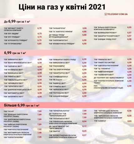 Так, у квітні 2021 року найдешевший тариф становить 6,70 грн/куб. м. Одна з компаній-постачальниць почала квітневий демпінг. Далі ціни зростають та три постачальники виставляють 6,75 грн/куб. м по Україні. Решта компаній, які вирішили зробити блакитне пальне дешевшим, ніж в опалювальний сезон, недалеко відійшли від позначки 6,99 грн/куб. м. Одна пропонує ціну в 6,85 грн/куб. м, три інших разом з "Нафтогазом" підіймають її на одну копійку. А ближче за все в інтервалі від 6,88 грн/куб. м до 6,98 грн/куб. м відзначилися 7 компаній.