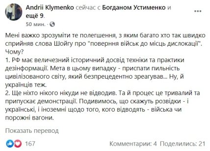 "РФ має величезний історичний досвід техніки і практики дезінформації. Мета в даному випадку - приспати пильність цивілізованого світу, який безпрецедентно зреагував... Ну, і українську теж, - пише Клименко. - Ще ніхто нікого нікуди не відводив. І процес цей тривалий і передбачає демонстрації. Подивимося, що скажуть розвідки - і українські, і іноземні щодо того, кого відводять - війська або порожні вагони".