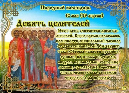 Православна церква 12 травня шанує пам'ять дев'яти святих мучеників Кизичеських. У народному календарі дата отримала назву дев'ять мучеників, або дев'ять цілителів, а за прикметами на день судили про урожай і про літо.