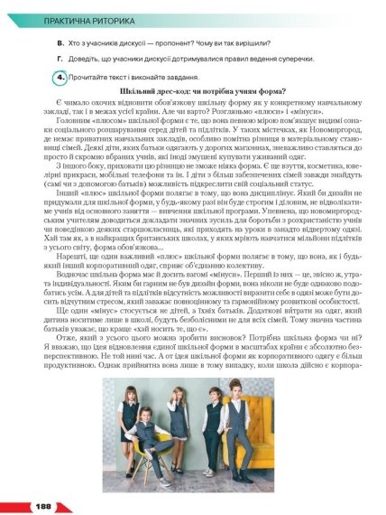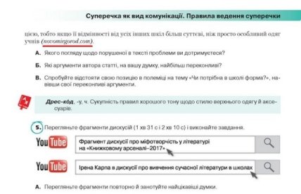 Відповідне посилання розміщене на сторінці 189. У тексті завдання школярам розповідається про ситуацію в Новомиргороді в контексті дискусії про необхідність носити шкільну форму.