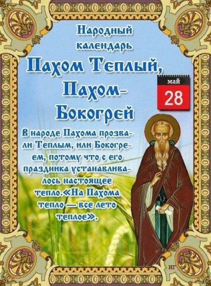28 травня православна церква згадує пам'ять двох святих Пахомов. У народному календарі дата отримала назви Пахом Теплий, Пахом-бокогрей, Пахомов день, а прикмети дня кажуть, що якщо весь день теплий, то й літо порадує теплом.