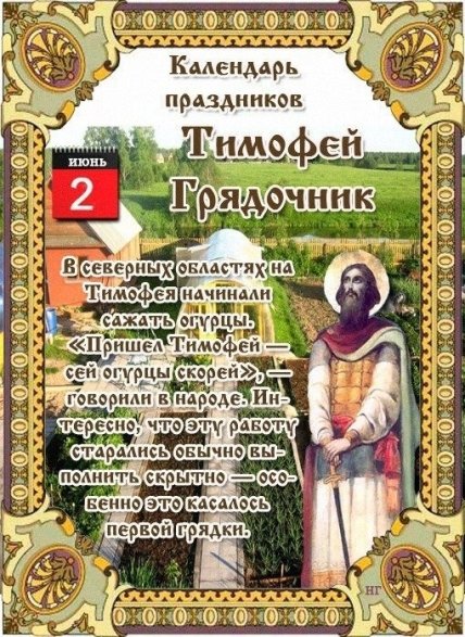 2 червня православна церква відзначає пам'ять мучеників Фалалея, Олександра і Астерія. За прикметами на 2 червня визначали, яким буде урожай огірків. У народному календарі день отримав кілька назв: "Тимофій Грядочнік", "тепловий", "Огуречник", "Городнє прясло".