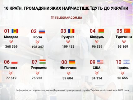 Росія, Румунія, Польща та Угорщина також потрапили в перелік країн, звідки туристи їдуть в Україну. На першому місці - сусідня Молдова, вона лідирує зі значним відривом. Другою стала Росія - за перші пів року 2021, майже 200 тисяч росіян приїжджали в Україну.