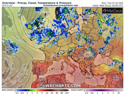 У середу, 28 липня, Україну зачепить північними циклонами, через що частина областей опиниться під сильними дощами і навіть градом, в той час як в інших і далі буде спека.