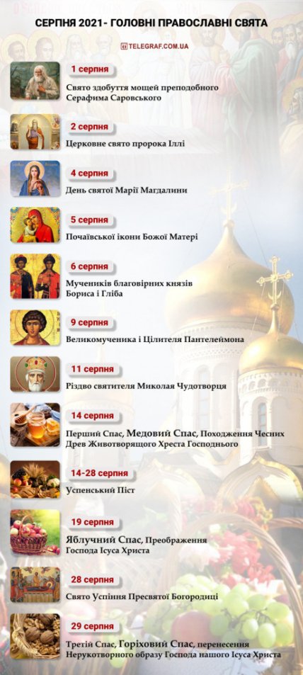 Також на останній місяць літа припадає строгий Успенський піст і кілька одноденних постів: 4, 6, 11, 13 серпня.