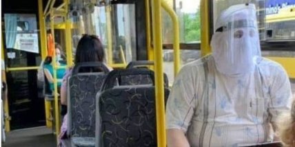 У Києві в одному з тролейбусів помітили пасажира, на якому був суперзахист від коронавірусу - прозорий екран-щиток, а під ним ще й тканина.