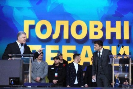 Кандидати у Президенти України Петро Порошенко та Володимир Зеленський під час дебатів на НСК "Олімпійський", в Києві, 19 квітня 2019 року.