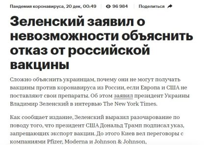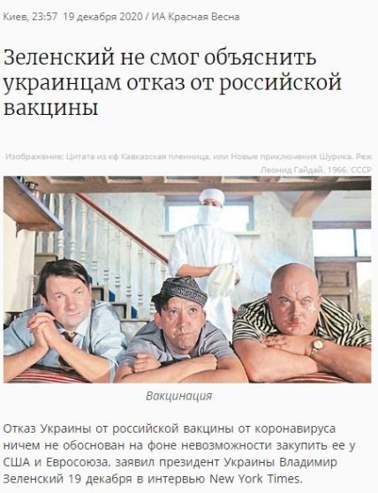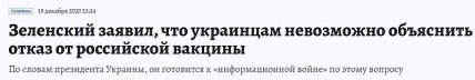 "Відмова України від російської вакцини від коронавируса нічим не обгрунтований на тлі неможливості закупити її у США і Євросоюзу", "Президент України Володимир Зеленський поскаржився на бажання українців отримати російську вакцину від коронавируса", "Зеленський пояснив неможливість відмовитися від російської вакцини", "У Зеленського немає пояснення відмови від російської вакцини ", - пишуть вони.