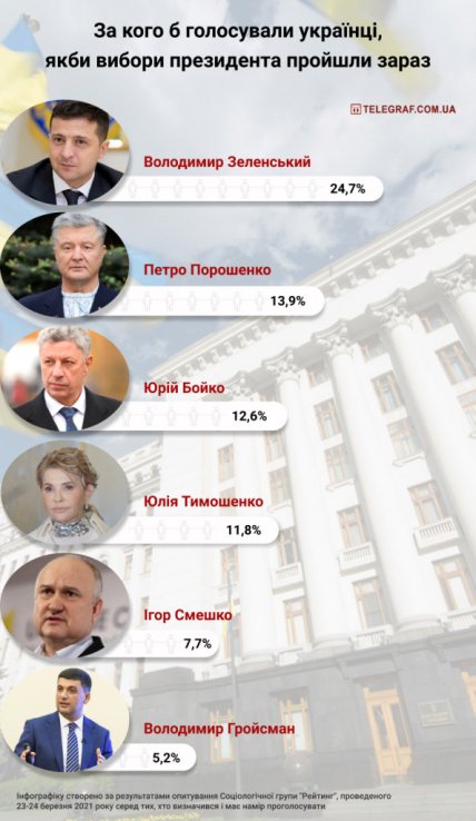 Згідно з наданими даними, в 24,7% громадян готові віддати свій голос за Зеленського, в той час як в опитуванні 22-23 лютого тільки 23,1% були готові зробити це.
