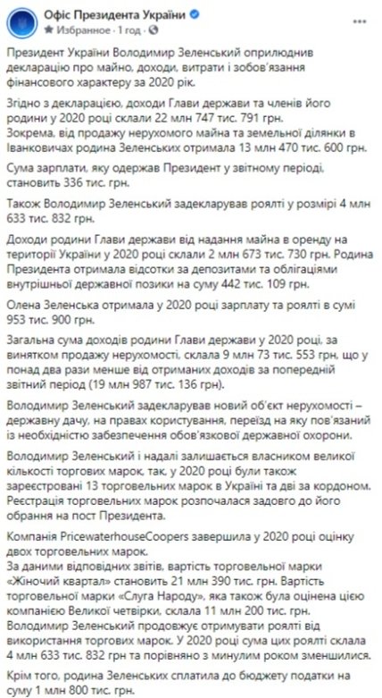 Так, згідно з декларацією, сукупний дохід Зеленського склав 19 113 279 гривень за рік. У власності Зеленського знаходиться квартира в Києві площею 254,5 кв. м., гараж і місце для паркінгу.