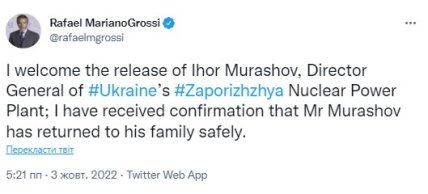 "Я вітаю звільнення Ігоря Мурашова, генерального директора Запорізької АЕС; Я отримав підтвердження того, що пан Мурашов благополучно повернувся до своєї родини", — написав голова МАГАТЕ.