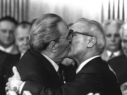 Фото поцілунку зробив Регіс Босс, воно прославилося на весь світ завдяки графіті "Боже мій, допоможи мені пережити цю смертельну любов" на Берлінській стіні. Зараз сфотографуватися навколо дивної пам’ятки приїжджають туристи з усього світу. Для справедливості скажемо, що поруч є і інші графіті. Авторські права на фотографію належать корпорації Corbis.