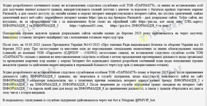 Стосується провадження, передовсім, конкретної фізичної особи, яка працювала кур’єром з прийняття коштів у тих, хто продовжував грати на сайтах "клонах" після закриття офіційного сайту Parimatch у зв’язку з накладенням санкцій.