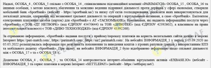 Ну а другий напрямок розслідування – це, власне, діяльність самого "Спортбанку" та його зв’язки з Parimatch. За інформацією слідчих, низка осіб, серед яких Андрій Савченко та співвласник компанії Parimatch Микита Ізмайлов (на скріншоті нижче – ОСОБА_14), з метою власного збагачення та можливо ведення підривної діяльності проти держави у сфері економіки, створили мобільний банк "Sportbank" та низку суб`єктів господарювання, реквізити яких використовуються для легалізації доходів, одержаних від незаконної гральної діяльності та операцій з віртуальними активами.