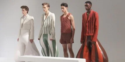Для свого показу в Лондонському коледжі моди Харікрішнан поєднав короткі жакети з екстра-широкими надувними шароварами.