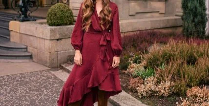 Сукня-халат із запахом гармонійно доповнює жіночий гардероб. Фасон виграшно виглядає на жінці будь-якої статури завдяки V-образним вирізом. Діагональні лінії крою візуально подовжують силует, роблять його стрункіше, вище, але особливості фігури модниці все-таки варто брати до уваги.
