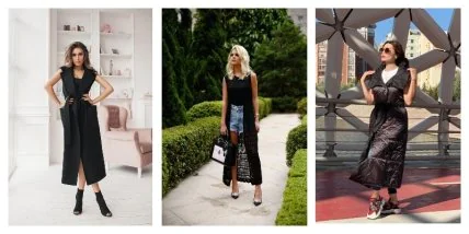 З довгим жилетом можна надіти брюки будь-якого крою, джинси, шорти, спідниці та сукні, водолазки, сорочки. З його допомогою візуально витягується жіночий силует, надаючи фігурі витонченість.
