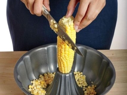Хочете почистити швидко і якісно кукурудзу? Форма для випікання кексу в допомогу. Як правило, така ємність має спеціально отвір посередині для того, щоб тісто рівномірно пропікається всередині. Але як виявилося, це саме отвір може послужити підставкою для кукурудзяного качана. Все що вам потрібно, так це вставити початок в цей отвір і видалити зерна ножем, які, до речі, будуть потрапляти в ємність, що не розлітаючись по всій кухні.