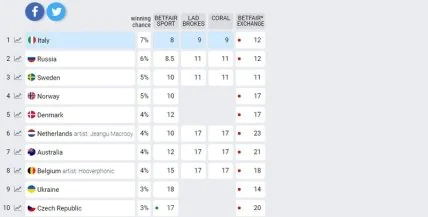Згідно з прогнозами букмекерів на офіційному сайті Євробачення, перемогу прогнозують артисту з Італії. Далі розташувалися представники Росії та Швеції.