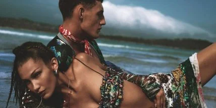 У чуттєвій фотосесії Белла Хадід і її партнер, манекенник Обрі О'Магоні, зображують двох закоханих, які усамітнилися на острові Сардинія.
