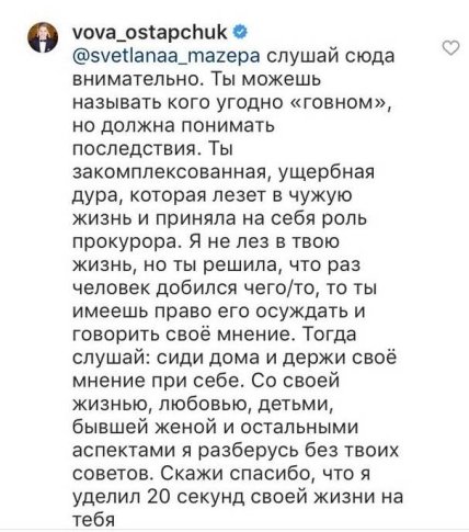Користувачка з ніком svetlanaa_mazepa назвала ведучого "брехуном чистої породи" і передбачила Остапчуку старість на самоті, яка прийде до нього в якості розплати за його вчинки. У відповідь на це ведучий назвав дівчину "ущербною дурепою" і закликав не лізти в чуже життя.