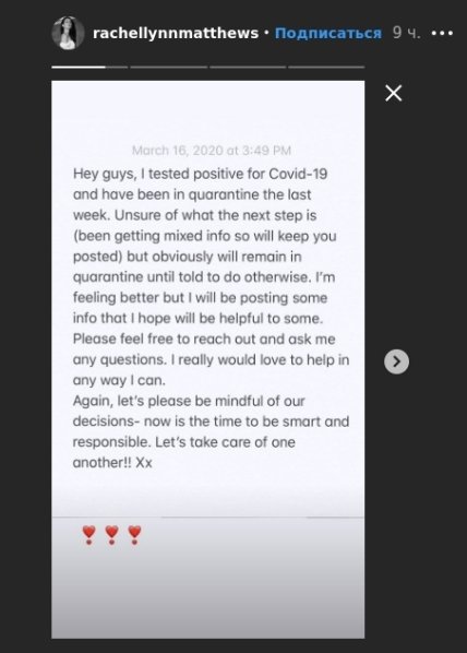 Крім того, Рейчел Меттьюз вирішила публічно розкрити всі симпоми захворювання, які вона відчувала на ранніх стадіях. Акторка зазначила, що наважилася до таких дій, аби вкотре власним прикладом нагадати кожному, що саме зараз той час, коли ми повинні бути відповідальними та дбати одне про одного.