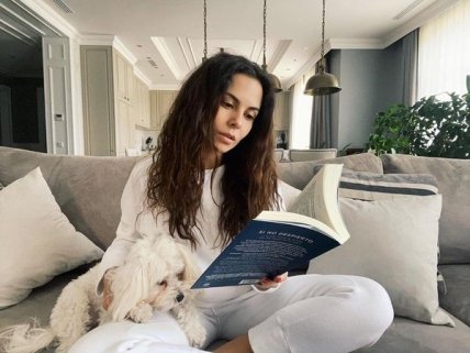 На фото Настя позує в білих штанях і светрі. У неї на коліні сидить її собака, яку вона обняла рукою. А сама Каменських у цей момент читає якусь книжку. Волосся у співачки було розпатлане. На тлі можна побачити диван, подушки, кімнатні рослини та інші атрибути інтер'єру.
